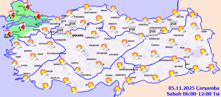 ANKARA (İGFA) – Meteoroloji Genel Müdürlüğü, 5 Kasım Çarşamba gününe ilişkin hava tahmin raporunu yayımladı.
